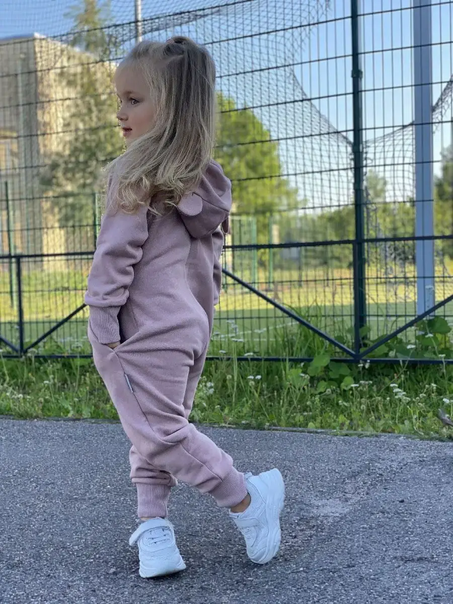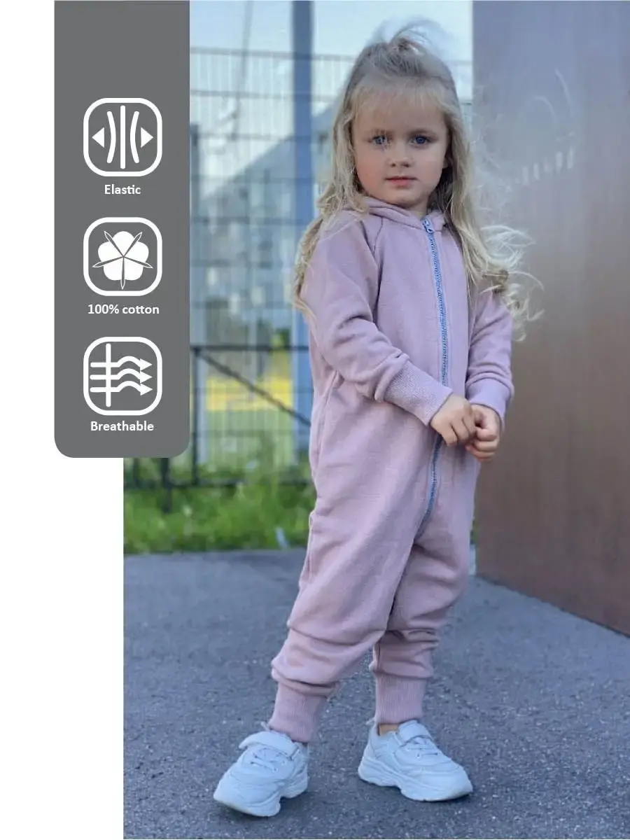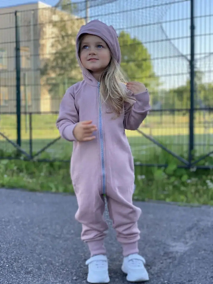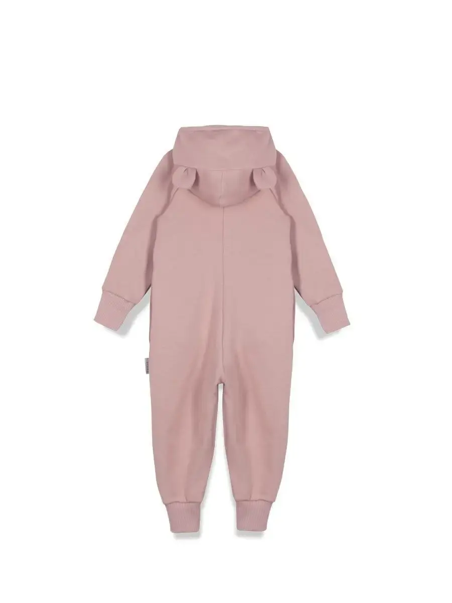 Комбинезон трикотажный детский на молнии из плотного футера для девочек, с втачным капюшоном с ушками, боковые карманы в швах, трикотажные манжеты на рукавах и штанинах с возможностью отворота.