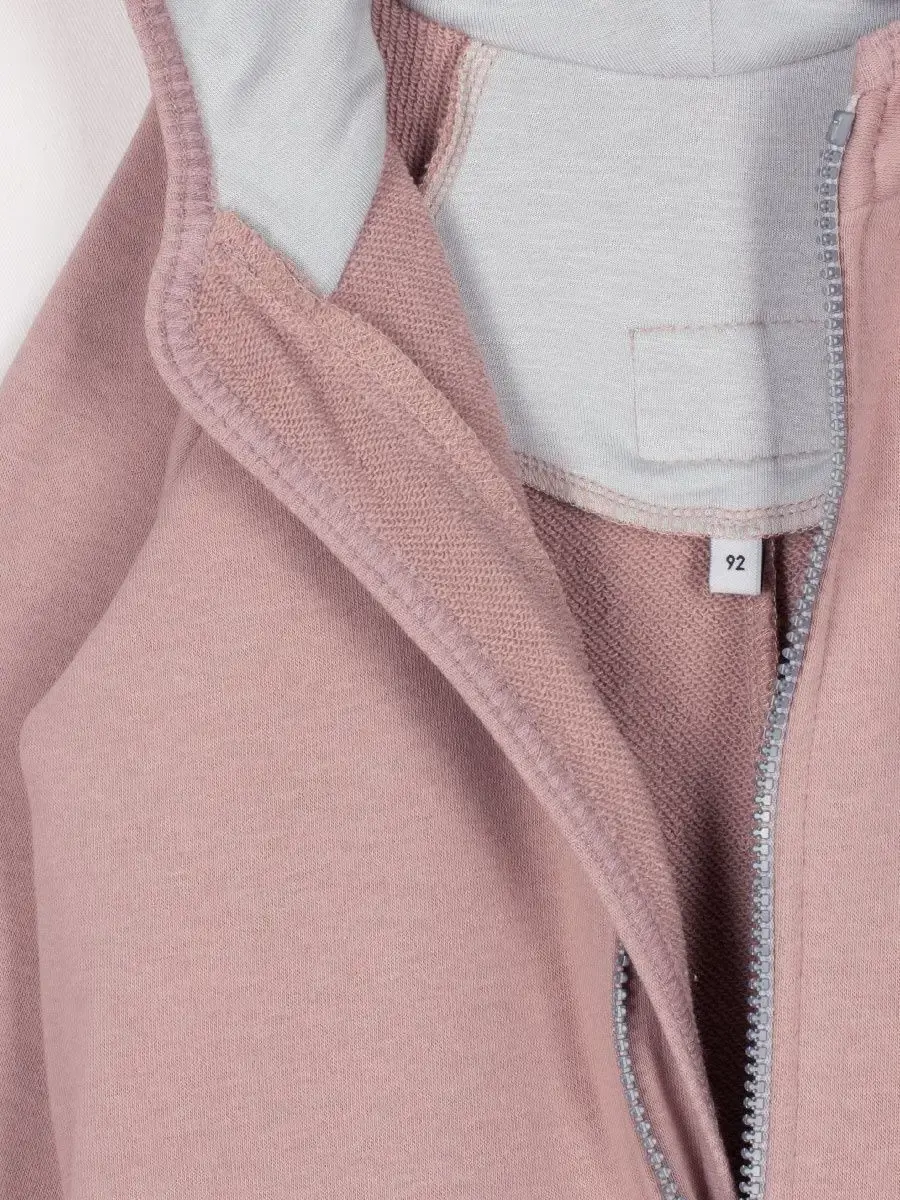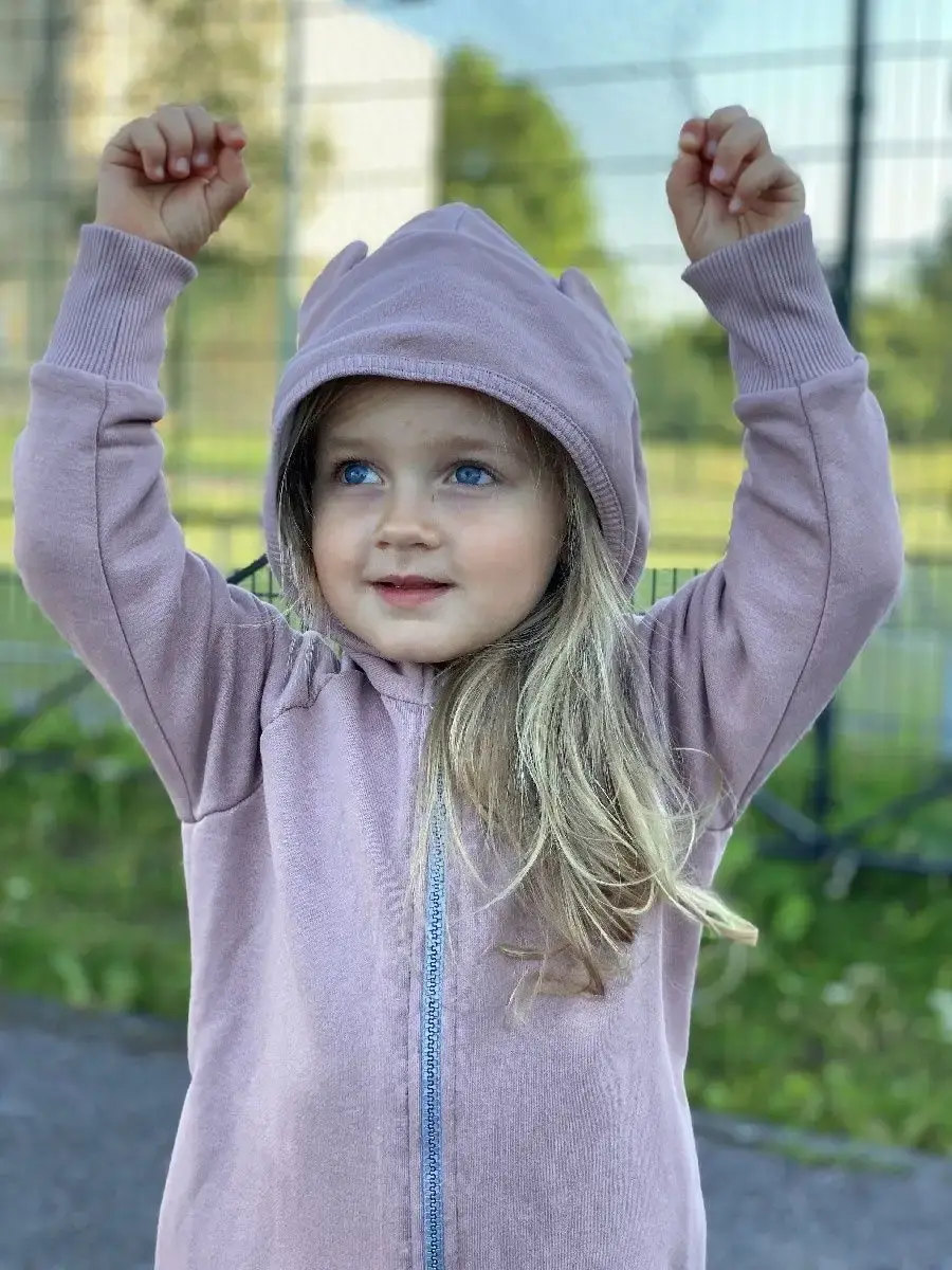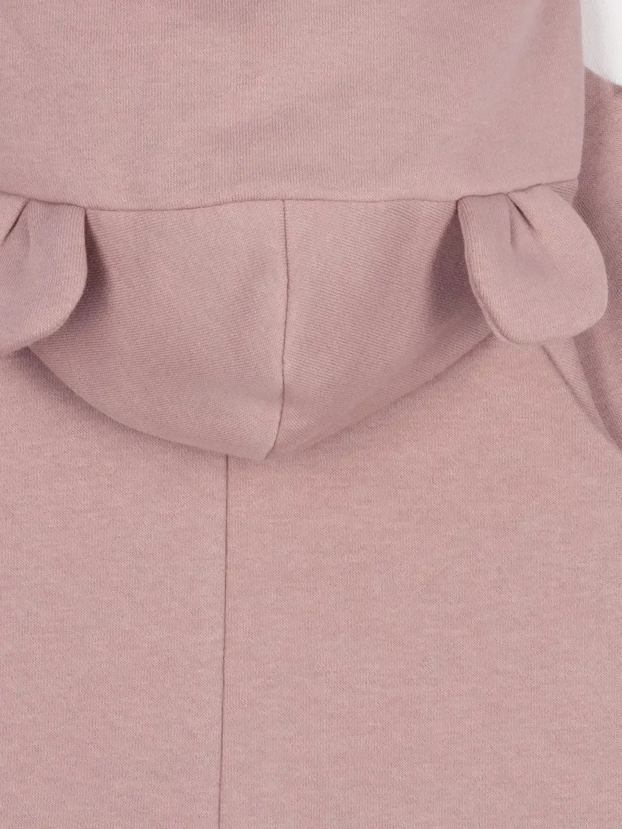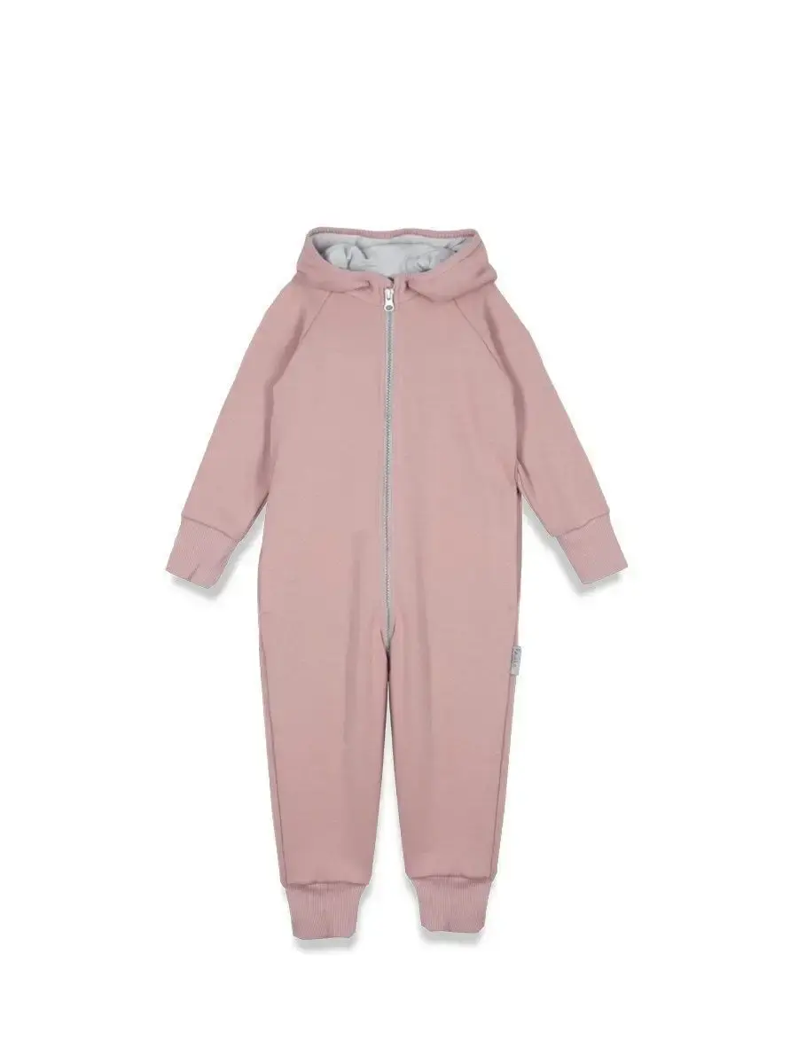 Комбинезон трикотажный детский на молнии из плотного футера для девочек, с втачным капюшоном с ушками, боковые карманы в швах, трикотажные манжеты на рукавах и штанинах с возможностью отворота.