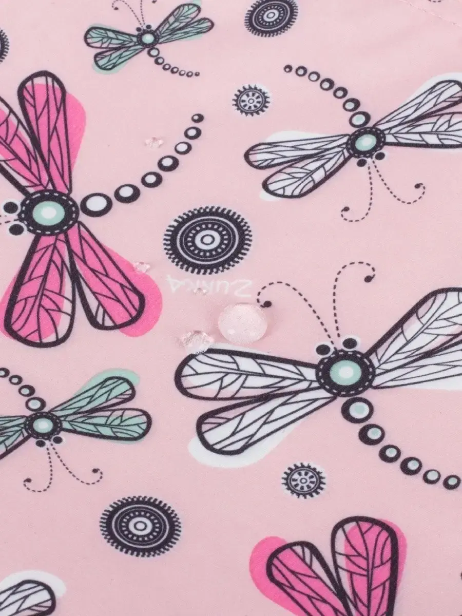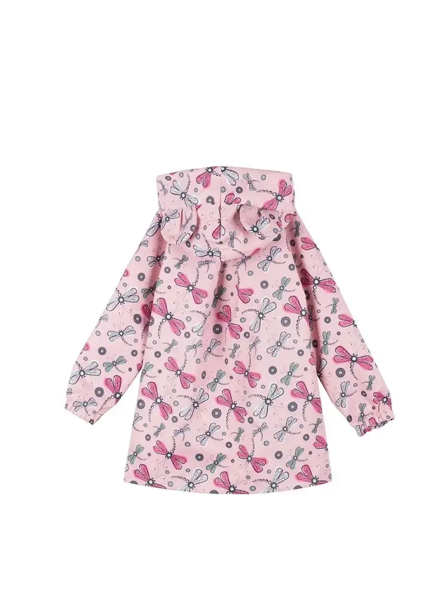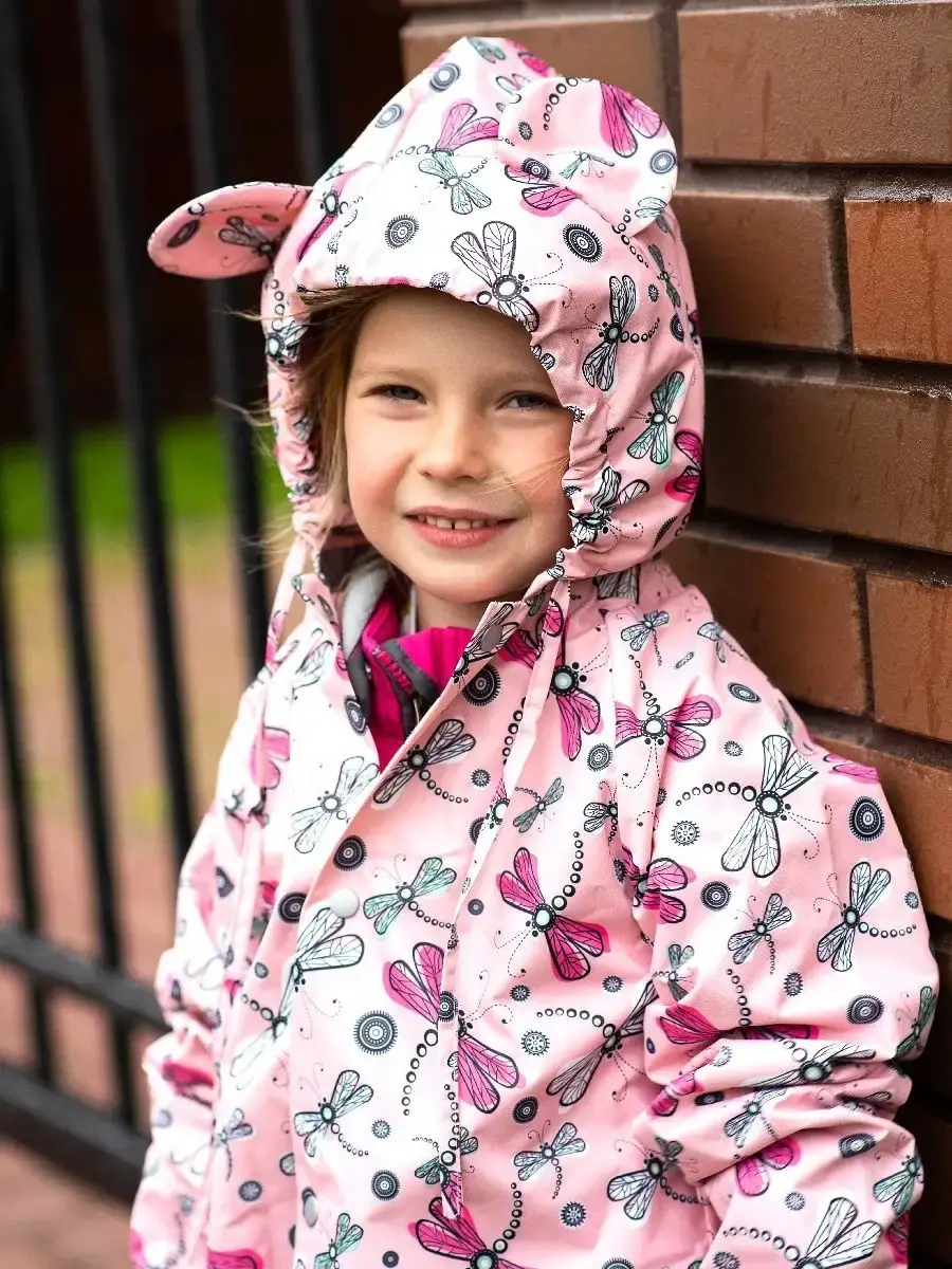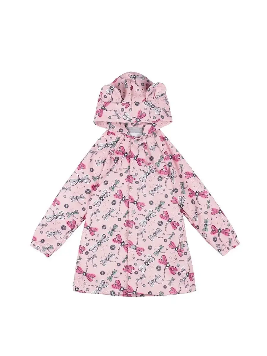 Плащ-дождевик детский на кнопках без подкладки для девочек, шов горловины проклеен, капюшон с декоративными ушками мышки и регулировкой объема шнуром, рукава на резинке, в комплекте сумочка для хранения плаща на молнии. Можно одевать поверх лекгой куртки или без нее. Без утеплителя. Ткань верха - мембрана 3000/3000, отлично защищает от ветра и влаги, легко очищается.